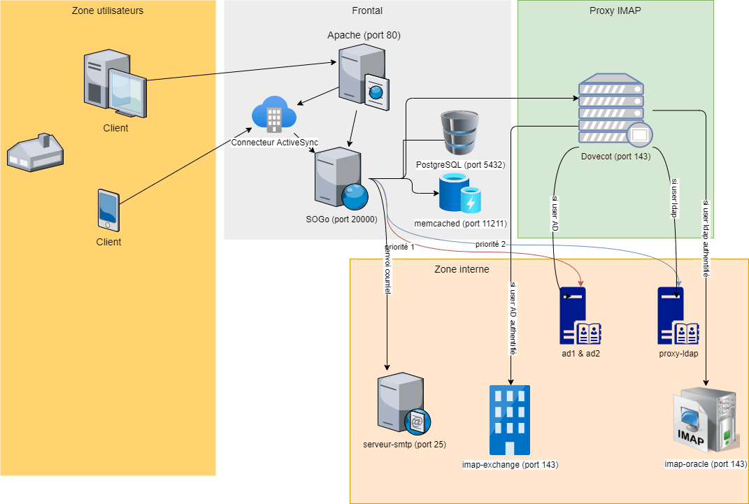 Un proxy sous Dovecot a été installé afin de permettre aux utilisateurs de se connecter de façon transparente à la messsagerie, qu’ils se trouvent sous Oracle ou sous Exchange.
